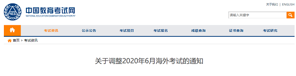 5月26日,中国教育考试网发布通知,鉴于海外考试考点所在高校尚未对外开放,近期不具备组考条件,经研究并商相关国外考试主办机构,决定对6月份海外考试做如下调整: