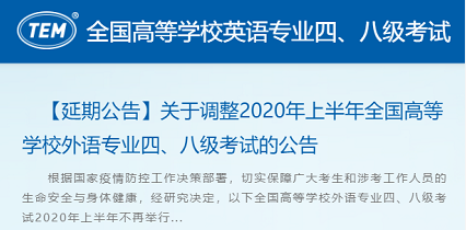 1. 原定于2020年3月21日举行的全国高等学校英语专业八级考试和原定于2020年4月18日举行的全国高等学校英语专业四级考试;
