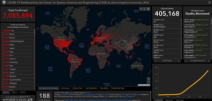 据美国约翰斯·霍普金斯大学发布的实时统计数据显示,截至北京时间6月9日5时33分左右,全球累计确诊新冠肺炎病例7085894例,累计死亡405168例。