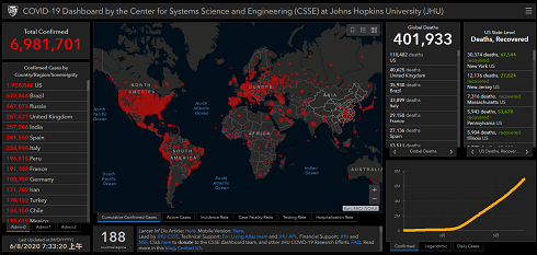 根据世卫组织最新实时统计数据,截至北京时间6月7日21时47分,全球确诊新冠肺炎6799713例,死亡397388例。