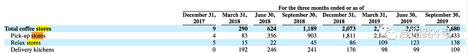 据招股说明书,截止2019年9月30日,瑞幸拥有3680家门店,其中3433家为取货店(只提供外卖或上门取货),138家为休闲店(店面较大)和109家外卖厨房。截止2019年12月31日,瑞幸在中国拥有4507自营门店,“按门店数量计算,我们是中国最大的咖啡销售网络。”