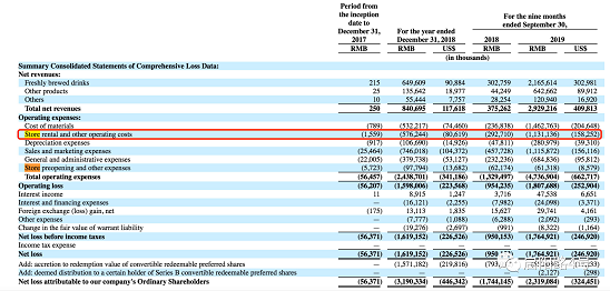 需要注意的是,瑞幸是典型的轻资产运营,门店并非自有,黄金地段的门店也需要支付高昂租金。随着门店数量增长,门店租金和营运开支也从2.92亿元(2018年前三季度)涨到11.3亿元(2019年)。