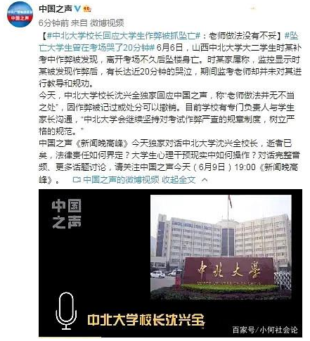 近期,山西中北大学大二学生补考作弊被抓后坠亡事件引起热议,学生家属认为监考老师没有及时对学生进行心理疏导,这才导致悲剧的发生。面对家属的指责,中北大学校长对此事做出回应,接下来我们一起来看看吧!