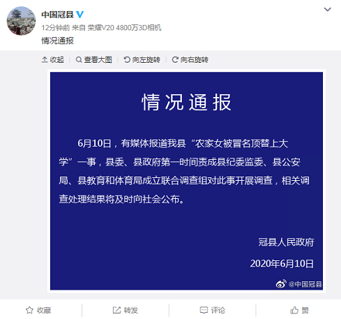 6月10日晚,山东省冠县人民政府官方微博发布通报称,针对媒体报道的“农家女被冒名顶替上大学”一事,县委、县政府第一时间责成县纪委监委、县公安局、县教育和体育局成立联合调查组对此事开展调查,相关调查处理结果将及时向社会公布。
