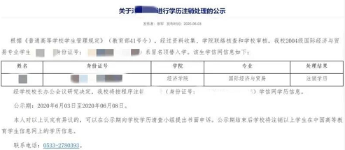 6月3日,山东理工大学在其官网发布一则《关于对陈秋媛进行学历注销处理的公示》。公示称,“经过资料收集、学院联络核查和学校审核,我校2004级国际经济与贸易专业学生陈秋媛系冒名顶替入学,经学校校长办公会议研究决定,我校将按程序注销陈秋媛学信网学历信息。”