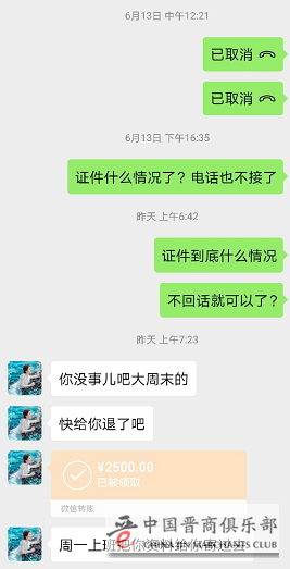 6月13日(周六),委托单位多次拨打其业务人员电话,其业务人员电话、微信均无回复,6月14日早山西天福瑞企业管理咨询有限公司业务人员强行将代办款项以个人微信转账的形式退还,并出言不逊。并于6月15日(周一)一早将办理证件所有材料(营业执照、公章)送回。