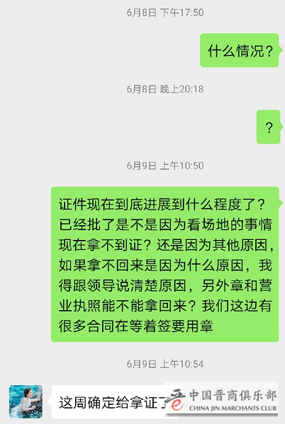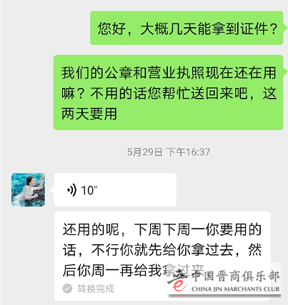 5月28日,山西天福瑞企业管理有限公司回馈信息为“已受理,就等拿证了”并说办理证件所有材料(营业执照、公章)需要持续使用。自5月28日至6月9日,山西天福瑞企业管理有限公司一直称“就等拿证了,没有其他任何意外”,因委托单位需要使用公章,多次联系其业务人员催进度,其业务人员始终拖延,在此期间与其公司业务人员联系过程中各种不顺畅,经常出现电话不接、微信不回的现象。