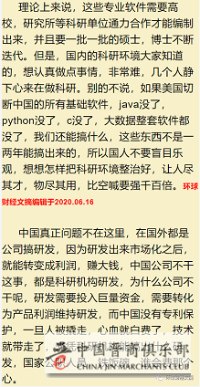 首先我们的确有世界最大的交易流量网站阿里巴巴,但是另外一面超过99.99%的工业基础软件都是需要美欧授权,其实一个是基础层面,一个是应用层面,工业软件跨多个基础学科的,一个是纯信息计术产业的应用,基础不牢,上层应用只能模仿别人的。