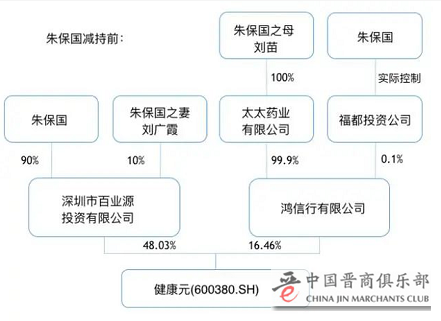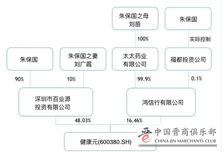 深圳市百业源投资有限公司和鸿信行有限公司(境外法人),一直是健康元的大股东和二股东。前者,朱保国持股90%,其妻刘广霞持股10%;而后者,在2015年4月前,由太太药业公司持股99.9%、福都投资公司持股0.1%。其中,福都投资实际控制人是朱保国,太太药业100%股份系朱保国母亲刘苗持有。