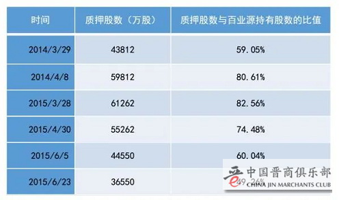 截至2015年6月23日,百业源公司累计质押健康元365,500,000股,占健康元已发行总股本的23.64%,朱保国质押百业源股权的比例降到了49.2%,已在50%以下的安全区间。
