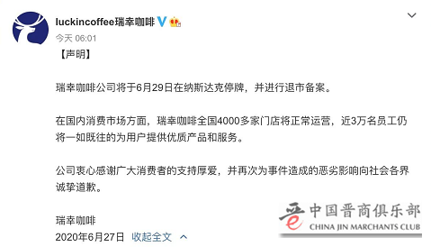 据瑞幸咖啡官微消息,瑞幸咖啡公司将于6月29日在纳斯达克停牌,并进行退市备案。