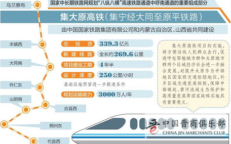 集大原高铁是国家中长期铁路网规划“八纵八横”高铁网呼南通道的重要组成部分。项目由中国国家铁路集团有限公司和内蒙古自治区、山西省共同建设,总投资339.3亿元,建设工期4.5年。项目北接内蒙古自治区乌兰察布市,途经我省大同市、朔州市,南连忻州市并经由大西客专与太原市贯通,设乌兰察布、丰镇西、大同南、怀仁东、应县西、山阴南、朔州东和代县西8座车站。项目建成后,呼和浩特至太原、大同至太原乘车时间将分别缩短为150分钟、76分钟。