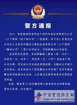 近日,我局接贵阳南明老干妈风味食品有限责任公司(以下简称“老干妈公司”)报案称:有不法人员冒充该公司名义与深圳市腾讯计算机系统有限公司(以下简称“腾讯公司”)签订合作协议,导致被腾讯公司起诉。经我局初步查明,系犯罪嫌疑人曹某(男,36岁)、刘某利(女,40岁)、郑某君(女,37岁)伪造老干妈公司印章,冒充该公司市场经营部经理,与腾讯公司签订合作协议。其目的是为了获取腾讯公司在推广活动中配套赠送的网络游戏礼包码,之后通过互联网倒卖非法获取经济利益。
