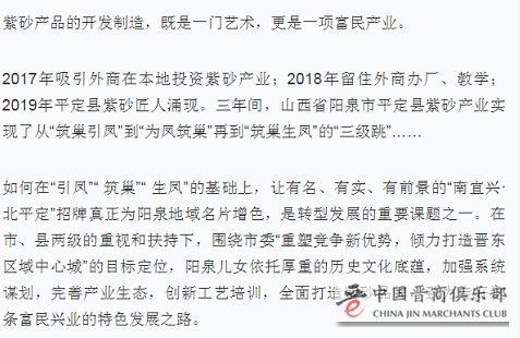 如何让平定紫砂这一产业真正“兴”起来、“强”起来?市两会之后,姜四清书记到平定县专题调研紫砂、砂器产业发展,鼓励平定紫砂产业要主动融入“重塑竞争新优势,倾力打造晋东区域中心城”这一目标定位,让大家在继续做大做强紫砂、砂器产业上有了更多的底气和更足的动力。