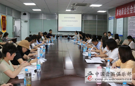 7月10日,苏州市工商联组织了异地商会社会组织等级评估政策解析与细则讲解专题培训,培训会在苏州市福建商会会议室举行。苏州市工商联经济联络处处长萧泰来、副处长尚东升、吴颖奇和今年申报参评的异地商会代表40多人参加培训会议。苏州市社会组织促进会秘书长郑天舒为大家作社会组织等级评估辅导。苏州市山西商会(中国晋商俱乐部联合发起机构)秘书处及商会会员志愿者唐鸿锦参加了培训。