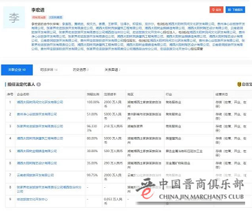 在李宏进担任法定代表人的9家公司中,有7家还在存续中,包含文化研发、旅游开发、建筑工程、金铜铸造、陶艺设计等领域。其中,李宏进持有贵州净心谷旅游开发有限公司51%的股份,持有张家界宏进旅游开发有限责任公司96.33%的股份,持有云南奇洞旅游开发有限公司99.75%的股份。