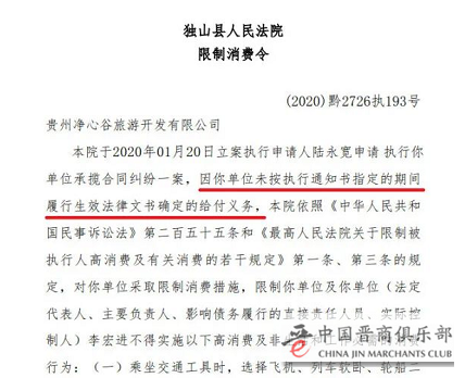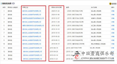 李宏进有多达14条限制高消费记录,从2018年11月起,李宏进频繁被限制高消费,而其中有12次与贵州净心谷旅游开发有限公司有关,占比达86%。最近一次限消令发布日期为2020年1月22日,原因为承揽合同纠纷,而2020年1月6日的限消原因则是“劳务合同纠纷”。