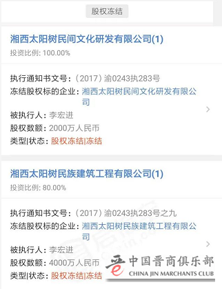 此外,李宏进还有2条股权冻结信息,发生在2017年,2020年10月才会解冻,其100%持股的湘西太阳树民间文化研发有限公司被冻结2000万元人民币,持股80%的湘西太阳树民族建筑工程有限公司被冻结4000万元人民币。