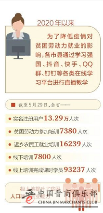 今年以来,为了降低疫情对贫困劳动力就业的影响,各市县通过学习强国、抖音、快手、QQ群、钉钉等各类在线学习平台进行直播教学。截至5月29日,全省实名注册用户13.29万人次,贫困劳动力参加培训7380人次。返乡农民工就业培训16239人次,线下培训7800人次,线上培训完成课时学员93237人次,极大地提升了贫困人口就业创业能力。