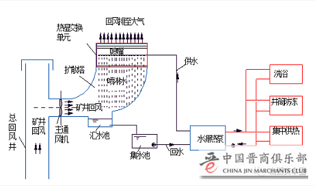 井下大约20℃的热风频频吹出来,而相对低温大约7℃的水通过喷淋系统喷出来接受热风加热,这个过程可以使大约7℃的水温度提高到15℃。这样温度的水还不能达到直接供热(包括暖气和暖风)的温度要求。还需要很重要的一步,经过水源热泵进一步提热处理。