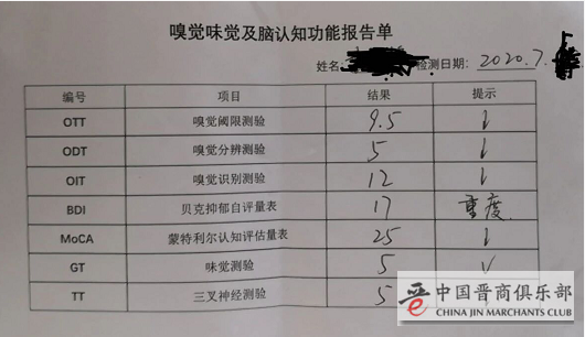 到7月中旬,张慧的嗅觉仍然没有恢复。她去了一家医院做检查,检查项目包括嗅觉阈值测验、嗅觉分辨测验、嗅觉识别测验、贝克抑郁自评量表、蒙特利尔认知评估量表、味觉测验等内容。在七个项目中,除了味觉测验,她的检查结果均不合格。