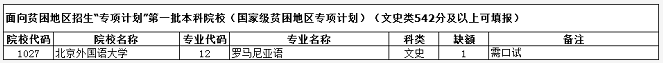 3、面向贫困地区招生“专项计划”第一批本科院校限国家级贫困县和省级贫困县符合条件的考生填报,国家级贫困县和省级贫困县详见《填报志愿指南》,文化课成绩:文史类 542分、理工类537分(部分院校文史类 522分、理工类517分)。