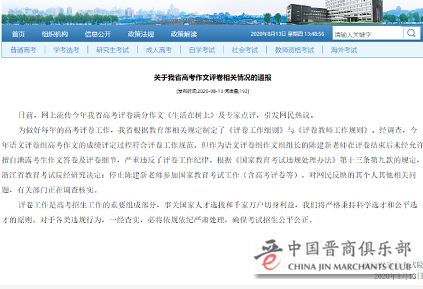 经调查,今年语文评卷组高考作文的成绩评定过程符合评卷工作规范。但作为语文评卷组作文组组长的陈建新老师在评卷结束后未经允许擅自泄露考生作文答卷及评卷细节,严重违反了评卷工作纪律。根据《国家教育考试违规处理办法》第十三条第九款的规定,浙江省教育考试院经研究决定:停止陈建新老师参加国家教育考试工作(含高考评卷等)。对网民反映的其个人其他相关问题,有关部门正在调查核实。