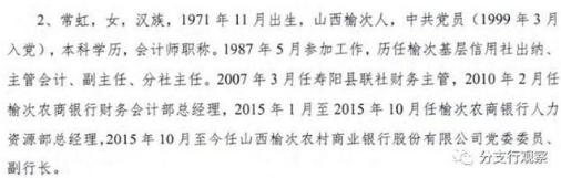 无独有偶,现任党委委员、副行长常虹1971年11月出生,1987年5月参加工作,也就是说不到16岁就参加工作,入党提干,考学历评职称,更是巾帼不让须眉。