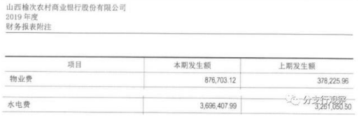 水电费支出没有明显的增长,也就是榆次农商行办公面积并未大幅增加,而物业费增幅却高达131%。这物业收费合理吗?个中原因,恐怕榆次农商行相关部门负责人也未必清楚,因为2019年报的物业费、水电费科目与2018年报相悖。