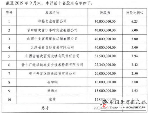 截至2019年12月末,该行法人股东12人,分别为:和柚实业有限公司(持股6.25%)、山西中宝富源煤炭运销有限公司(持股5.00%)、天津岳泰国际贸易有限公司(持股5.00%)、 晋中榆次晋江香叶实业有限公司(持股5.00%)、山西省榆次百货大楼有限责任公司(持股3.94%)、晋中广迪机动车安全技术检测有限公司(持股3.42%)、晋中开发区新泰经贸有限公司(持股2.50%)、山西金房子建业发展有限公司(持股1.25%)、晋中市永泰房地产开发有限公司(持股1.25%)、山西中捷钢结构彩板有限公司(持股1.25%)、山西正能量文化传媒有限公司(持股1.20%)、山西远征机电设备制造有限公司(持股1.01%)。