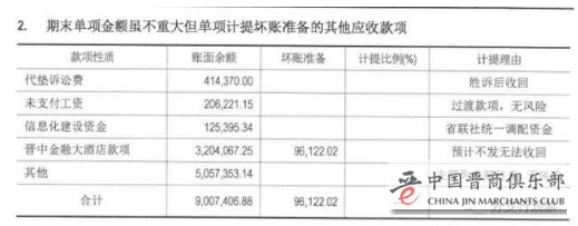 2019年报财务报表附注第33页,期末单项金额虽不重大但单项计提坏账准备的其他应收款项之晋中金融大酒店款项账面余额3204067.25元,坏账准备96122.02元,计提理由是预计不发无法收回。经查验国家企业信用信息系统,晋中金融大酒店不存在,疑似准确名称为山西省晋中信用合作社培训中心榆次金融大酒店,该酒店曾因生产经营添加可能危害人体健康物质的食品被处罚。