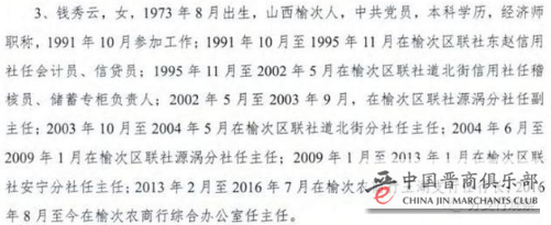 董事钱秀云,1973年8月出生,1991年10月参加工作,中共党员,本科学历,经济师。历经多个岗位,自2016年8月起任榆次农商行综合办公室主任。