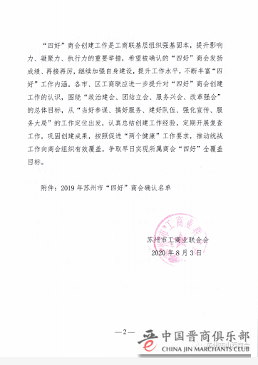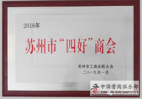 在张新会长正确带领下、在商会领导班子及会员共同努力下,我商会再次被评为2019年度苏州市“四好”商会,这是我商会第2次在异地40家商会中评选出的十家市“四好”商会之一,这充分体现出我商会在班子建设、团结教育、服务发展、规范自律等方面做出了一定的成绩,也是我们全体会员团结一致、共谋发展,为创建品牌商会所做的努力的结果。
