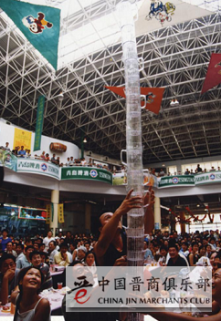 平时好喝点啤酒的市民高仲当天也约好了五六个同事,大中午赶到早已爆满的中山公园,好不容易挤进人啤酒城,高仲和同事就直接开喝了。逛到下午两三点,已经喝了十来瓶啤酒的高仲,在听到要举行喝啤酒比赛的广播后,趁兴报名登台。“比赛项目就是一瓶啤酒,看谁‘吹’得最快。”裁判员喊完“一、二、三”,高仲拿起酒瓶一仰脖,咕咚咕咚几口,一瓶啤酒全下了肚。计时员一报出“8秒1”的成绩也把高仲吓了一跳。“我也是第一次知道自己能喝这么快,那时的青岛啤酒都是大瓶的,一瓶640毫升。”凭着这个成绩,高仲夺冠,虽然当时没有“酒王”的称号,奖品也只是一件印着吉祥物的文化衫,但高仲就像得了奥运金牌一样兴奋。