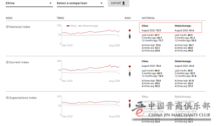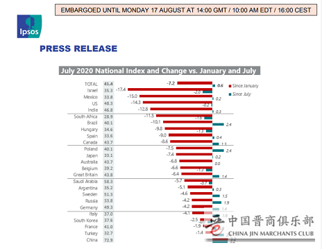 国际市场研究机构益普索(Ipsos)当地时间8月17日公布的调查结果显示,全球消费者信心指数在今年6月触底后出现反弹。而在参与调查的24国中,中国消费者信心指数为72.9,排名第一。