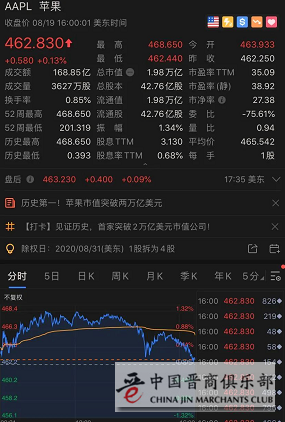 美股开盘后,苹果公司股价一度攀升至468.65美元,盘中市值突破两万亿美元,成为华尔街史上首家市值超过2万亿美元的美国公司,并巩固了其全球市值最大公司的地位。收盘时,苹果市值回落到1.98万亿美元。