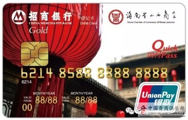 “招行-山西商会联名卡”:招商银行海口国兴支行为海南省山西商会特别定制发行的银行卡,专为身处海南的晋商量身打造,拥有独特的山西特色卡面设计,具有会员代扣会费的功能,享受会员企业消费优惠的折扣,满足山西商会会员多重金融服务需求。是专属于海南省山西商会的银行卡,凝聚了海南的晋商对家乡深深的归属感!