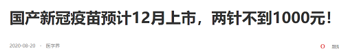 8月20日,据《光明日报》报道,中国医药集团有限公司(以下简称“国药集团”)党委书记、董事长刘敬桢介绍,“灭活疫苗上市后,价格不会很高,预计几百块钱一针。如果打两针的话,价格应在1000块钱以内。”