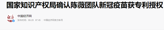 8月19日,国家知识产权局确认,有关“军科院军事医学研究院陈薇院士团队及康希诺生物联合申报的新冠疫苗专利申请已被授予专利权”的情况属实。该发明专利申请享有优先审查政策。
