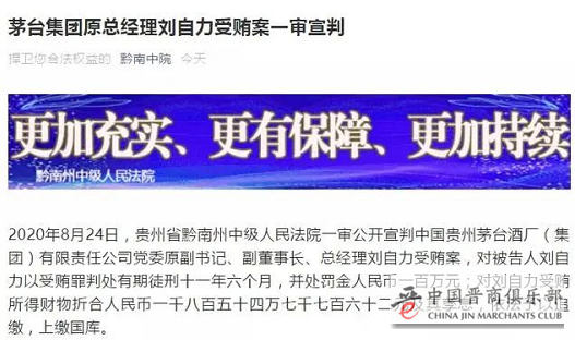 2020年8月24日,贵州省黔南州中级人民法院一审公开宣判中国贵州茅台酒厂(集团)有限责任公司党委原副书记、副董事长、总经理刘自力受贿案,对被告人刘自力以受贿罪判处有期徒刑十一年六个月,并处罚金人民币一百万元;对刘自力受贿所得财物折合人民币一千八百五十四万七千七百六十二元及其孳息,依法予以追缴,上缴国库。