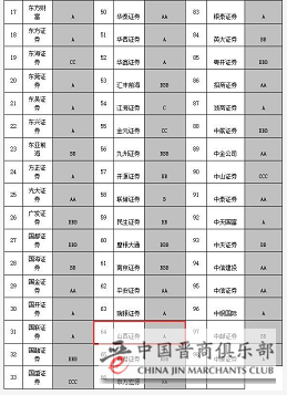 据了解,今年共有98家券商参与分类评级。其中,AA级券商15家,分别是:安信证券、光大证券、国金证券、国泰君安、国信证券、海通证券、华泰证券、平安证券、申万宏源、银河证券、招商证券、中金公司、中泰证券、中信建投、中信证券,比去年多5家,国泰君安和招商证券连续第13年为AA级券商,但AAA评级依然空缺。