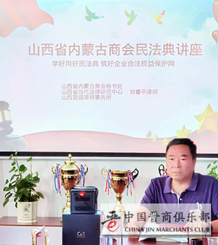 8月26日下午,山西省内蒙古商会举办“《民法典》进民企”专场讲座。旨在深入贯彻习近平新时代中国特色社会主义思想,引导民营企业家自觉学法、守法、用法,牢固树立诚信经营意识,运用法治手段保障民营经济健康发展,构建共建共治共享的商事治理格局,推动商会民营企业家以法治思维和法治方式依法依规提高发展能力和水平,促进民营企业健康发展,维护社会和谐格局。