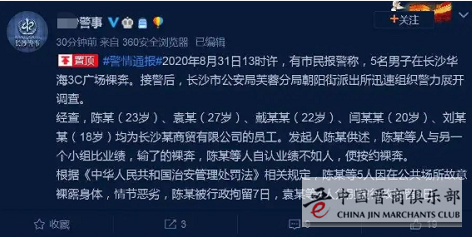 2020年8月31日13时许,有市民报警称,5名男子在长沙华海3C广场裸奔。接警后,长沙市公安局芙蓉分局朝阳街派出所迅速组织警力展开调查。
