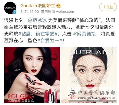 8月24日,LVMH集团旗下美妆品牌法国娇兰,在其官方微博上发布了由范冰冰拍摄的七夕限量版臻彩宝石唇膏广告海报,借此官宣范冰冰成为其品牌全球代言人。