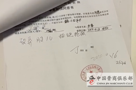 事实上,声明里说的“放弃胎儿,不再抢救”为丁芳所写,写在了那张有许俊签名的《手术知情同意书》的空白处。新京报记者看到,丁芳手写的实际字样为“放弃胎儿,拒绝抢救”,并有签名及标注时间——“2019.9.16”“23:46”。