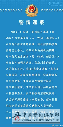 事情发生在9月6日,当时,重庆荣昌区李某(男,26岁)与前妻何某(女,25岁)在荣昌区荣滨南路相遇,因此前离婚债务问题发生争执,后约定到公安机关调解,途中何某换乘范某所驾驶车辆调头离开,往永川方向行驶。