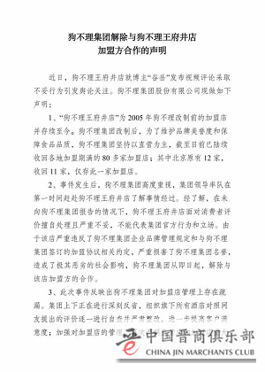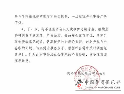 3、此次事件反映出狗不理集团对加盟店管理上存在疏漏。集团上下正在进行深刻反省,组织旗下所有酒店对照网友提出的评价逐一进行自查并严肃整改,进一步提高客户满意度;加强对加盟店的管理,再次严明自营店和加盟店重大事件管理报批规章制度和惩罚机制,一旦出现类似事件严惩不贷。