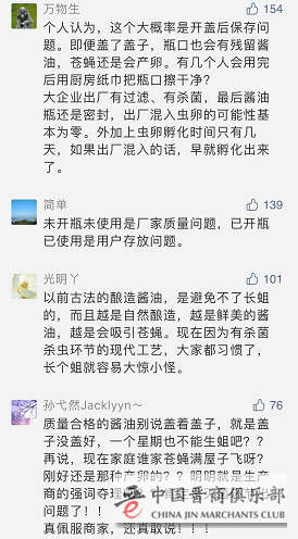 酱油生虫在夏天很常见,主要原因是开盖后,如未盖好盖子,酱油的香气会吸引苍蝇,有种苍蝇会直接产虫,因此有个研究机构专门做过研究,并出过一份科普视频。很多消费者都能正常理解这件事情。“我们公司产品生产环节会超细过滤,会高温巴氏灭菌,不能有虫子在产品中。”