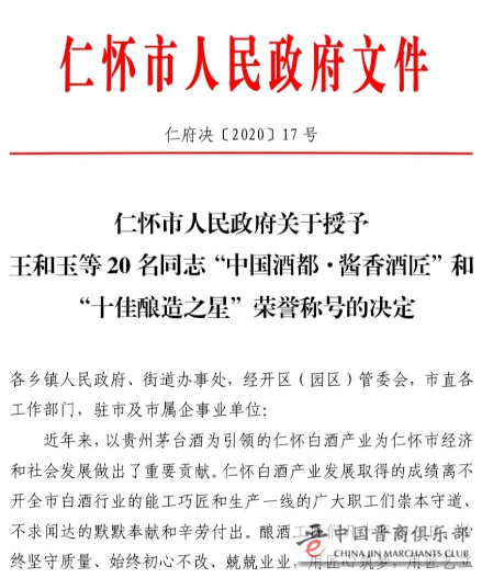 9月18日,仁怀市政府发布《关于授予王和玉等20名同志“中国酒都·酱香酒匠”和“十佳酿造之星”荣誉称号的决定》(仁府决[2020]17 号),引发社会对酱酒的美好向往,也折射出政府层面对酱酒产业通过专业人才培育成就品质的高度。
