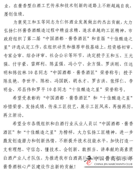 这份文件这样说到,近年来,以贵州茅台酒为引领的仁怀白酒产业为仁怀市经济和社会发展做出了重要贡献。仁怀白酒产业发展取得的成绩离不开全市白酒行业的能工巧匠和生产一线的广大职工们崇本守道、不求闻达的默默奉献和辛劳付出。酿酒工匠们几十年如一日,始终坚守质量、始终初心不改、兢兢业业,用匠心筑梦,用匠艺立业,在酱香型白酒工艺传承和技术创新的道路上不断超越自我,屡创佳绩。